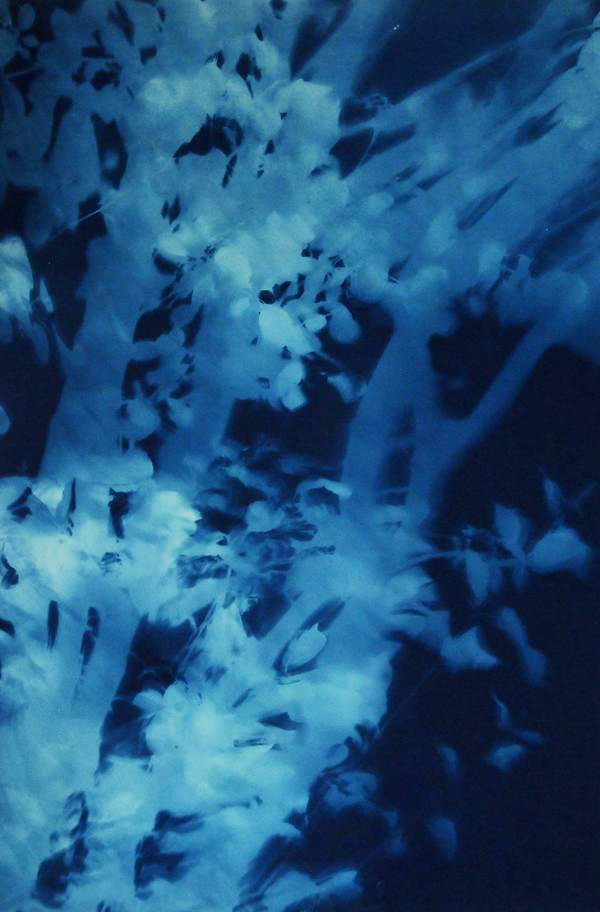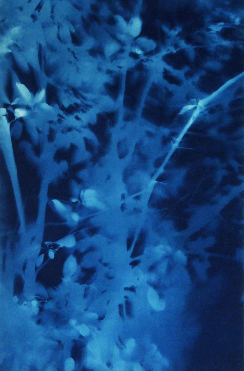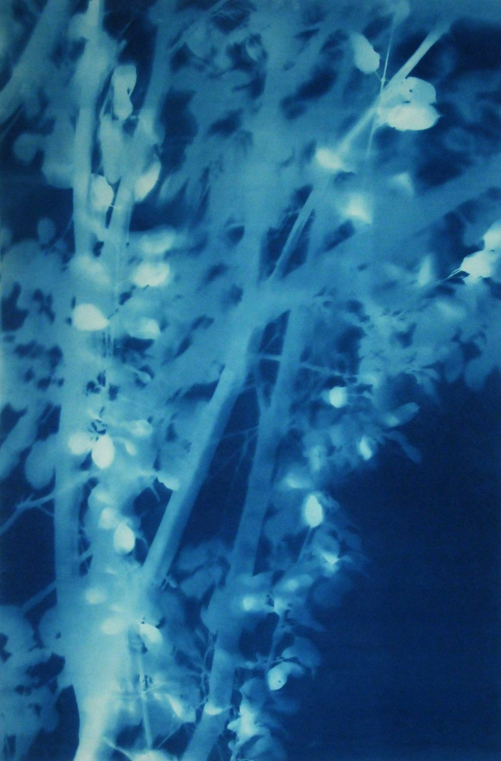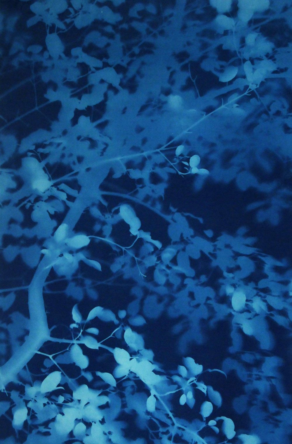 Fels’ cyanotypes are cameraless photographs, popularly called “sun prints” or “shadow prints.” There is no negative; each is unique. The prints are life-sized, 1:1 scale renderings of their natural subject matter obtained directly, outdoors, from bushes and trees. The Arbor, Catalpa, and other of Fels’ series are at once both empirical and romantic. The result of a technical process dependent on light and chemistry alone, these prints can be regarded on one level as simply unmanipulated records of the organic world. On another they are richly suggestive, capturing a deeply evocative sense of motion and form. A review in the Boston Globe observed that they “evoke the touch and movement of a friendly breeze.”